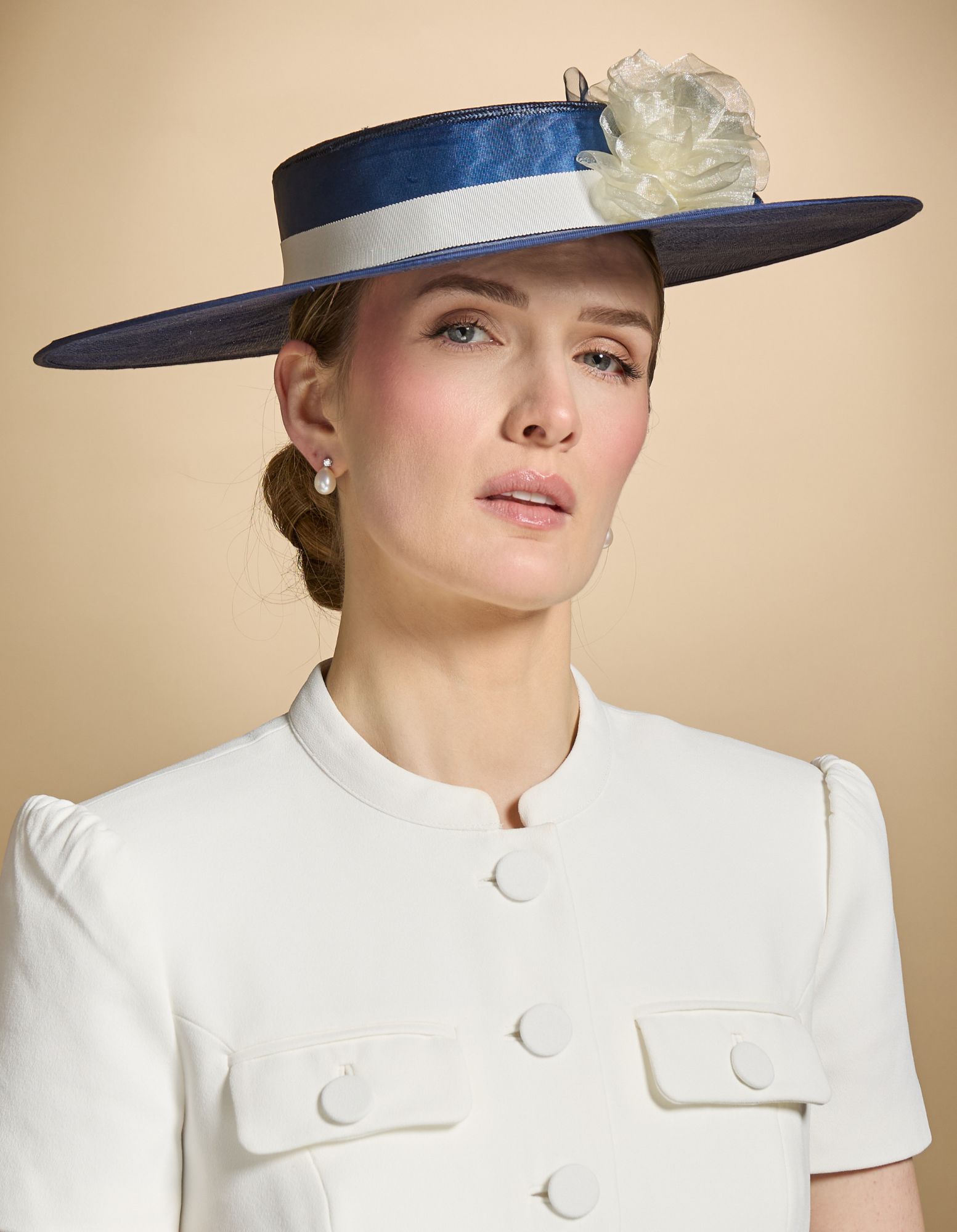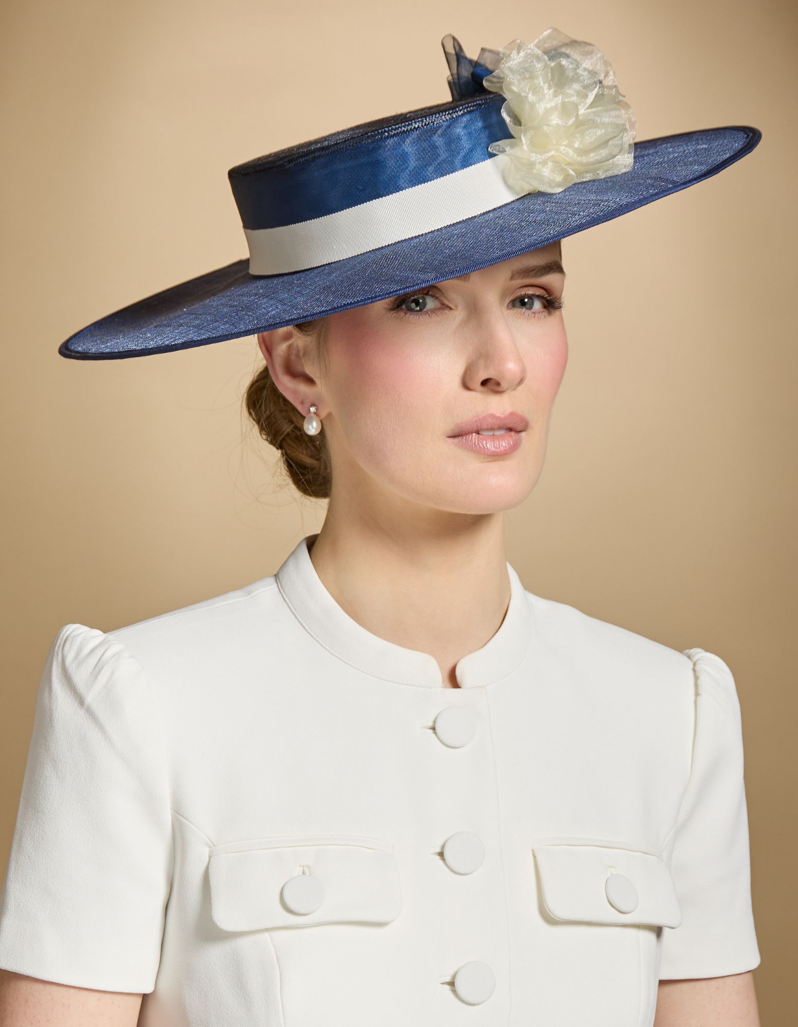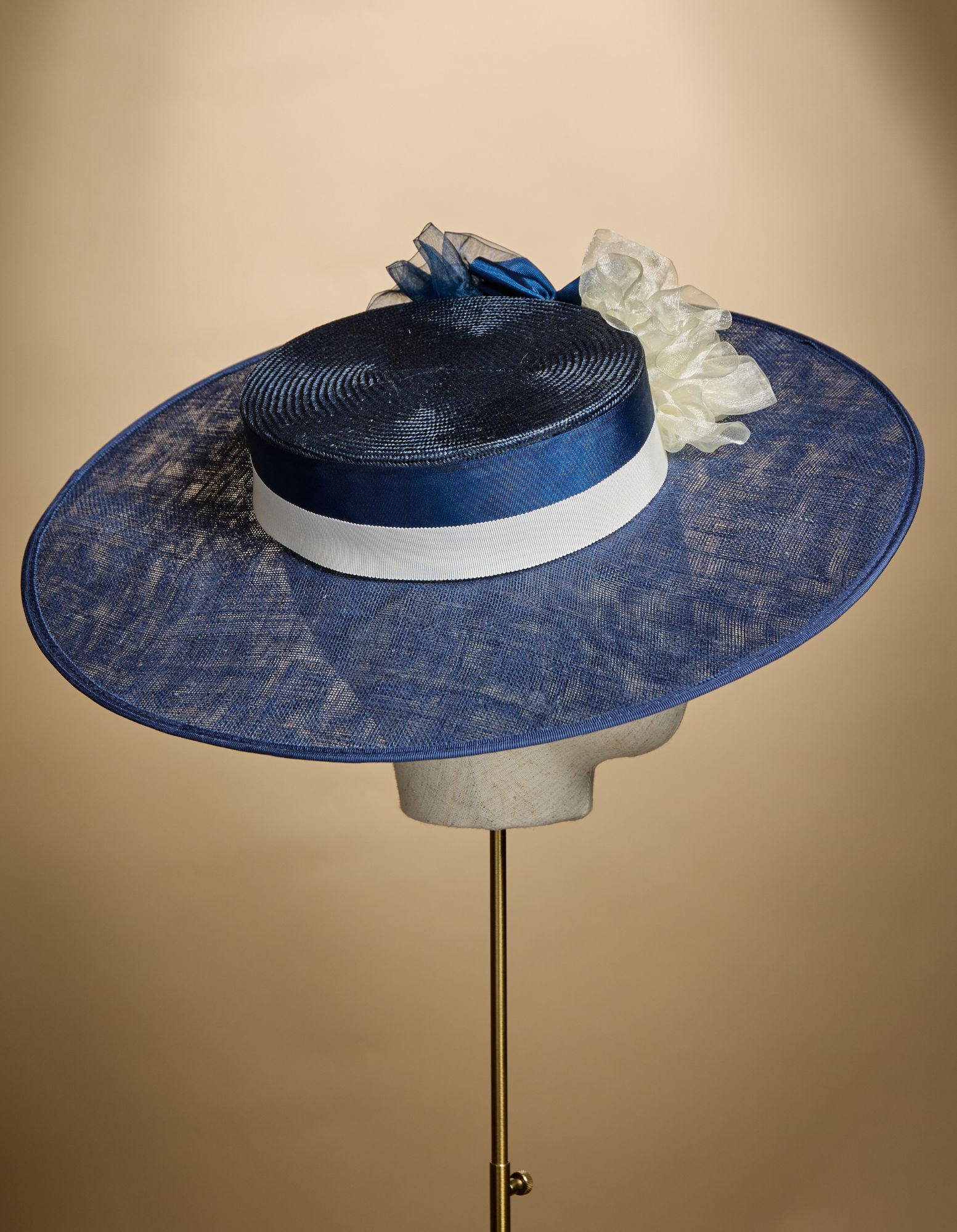 A lovely classic boater shape with a navy sinamay brim and a parasisal straw crown, trimmed with ribbons and organza silk ruffles.
