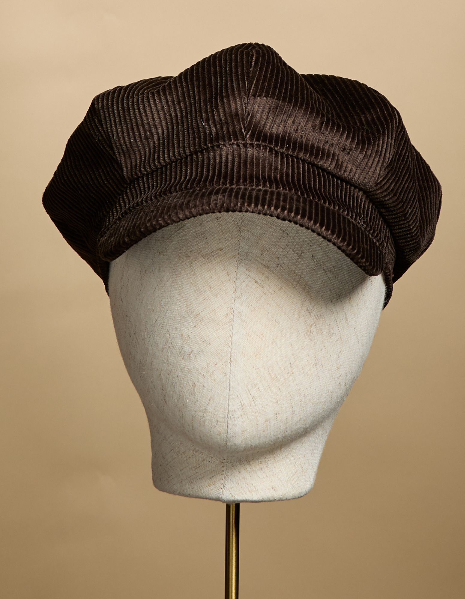 A chocolate brown cord baker boy cap. Finished with a lovely chocolate brown satin lining.