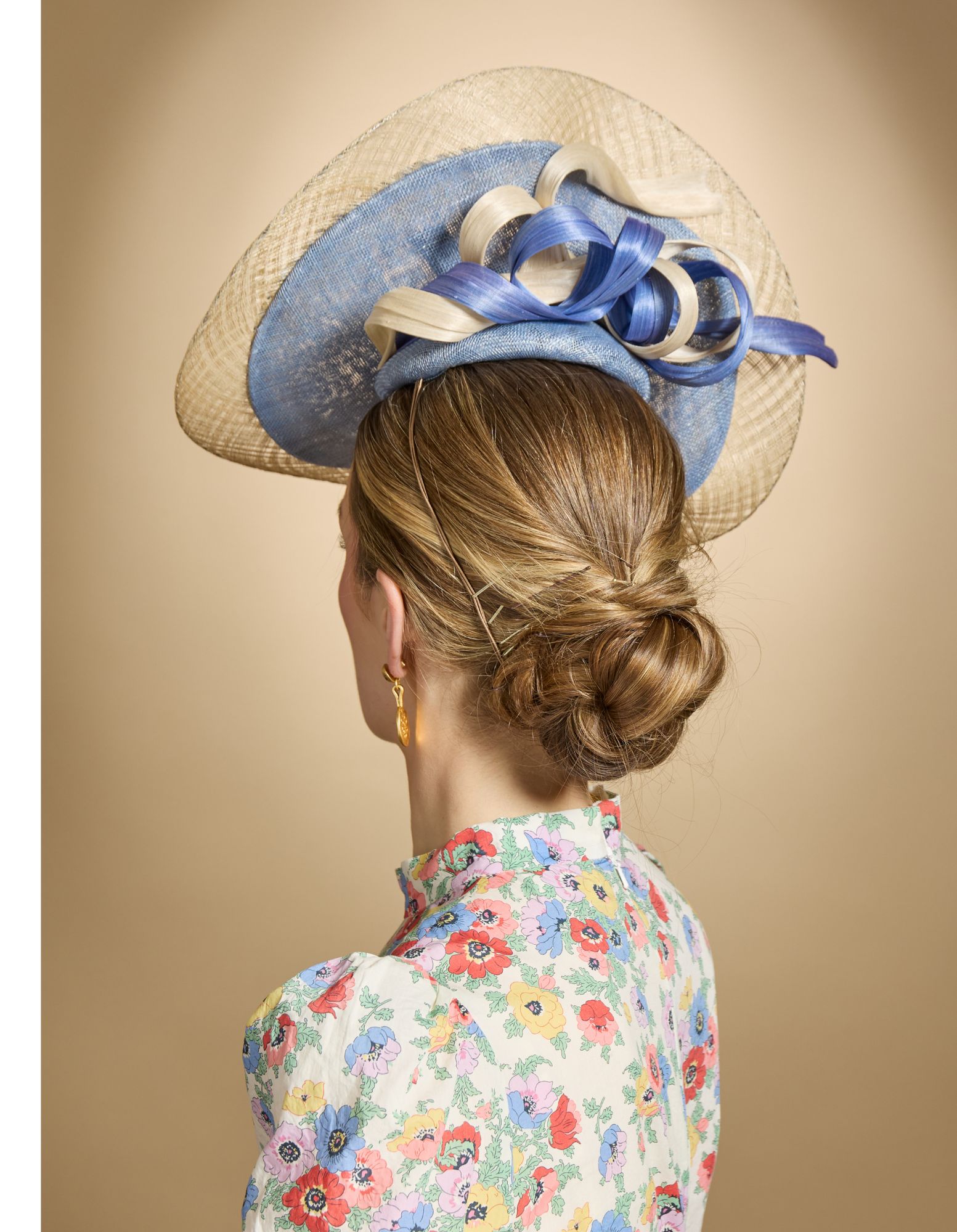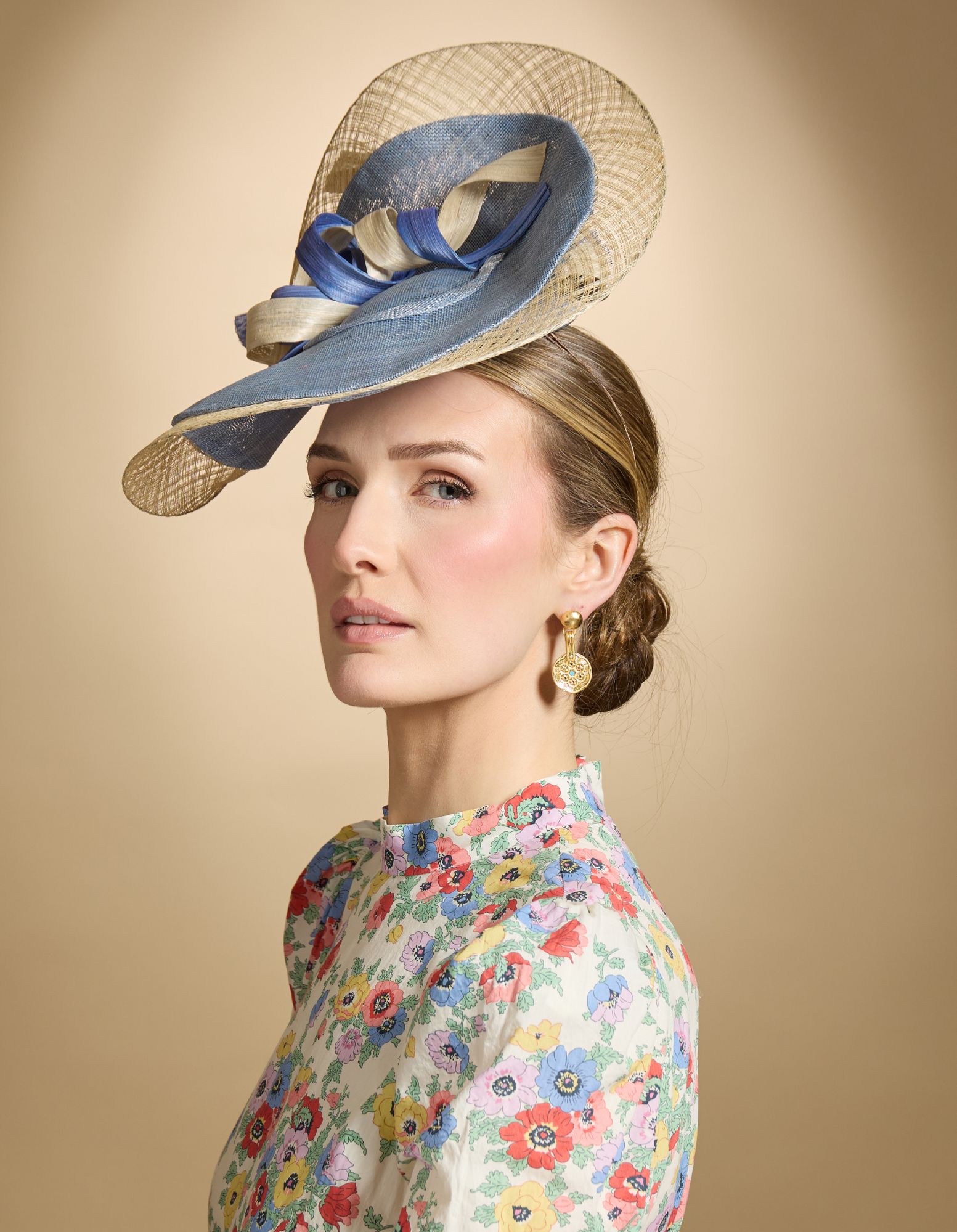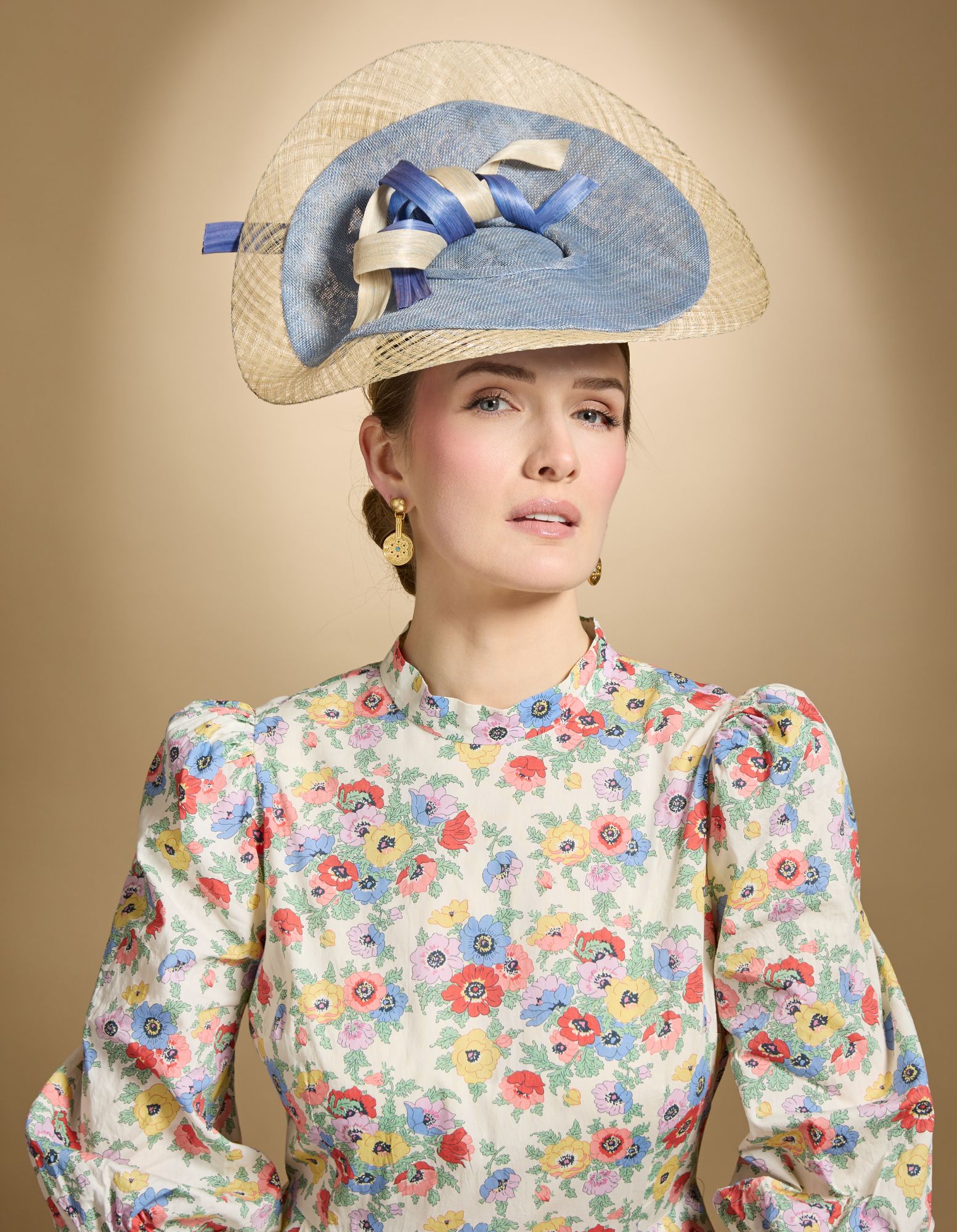 Made from cornflower blue and ivory sinamay, it is trimmed with loose curls of silk abaca.