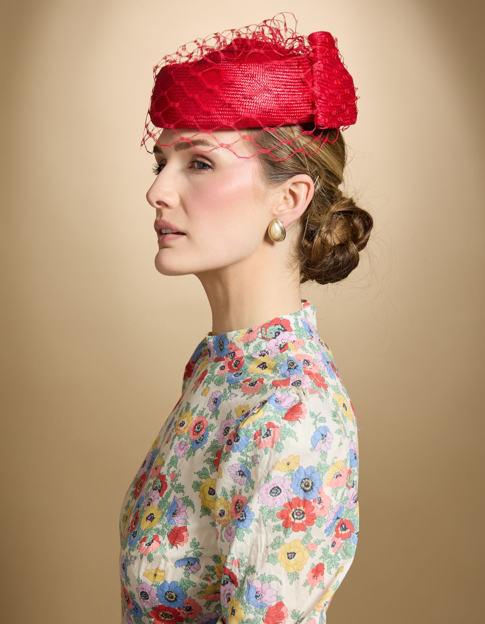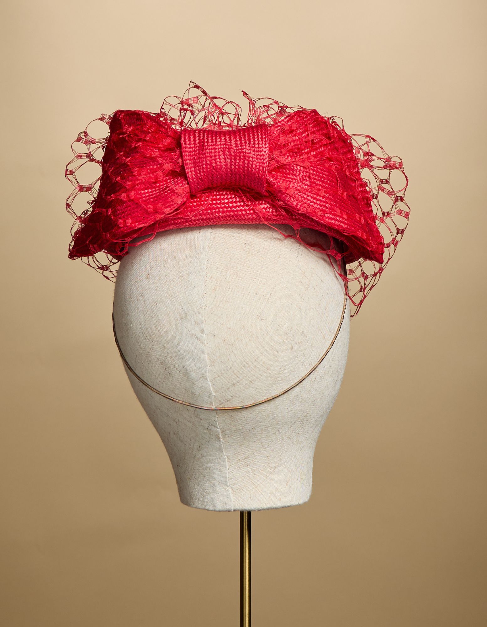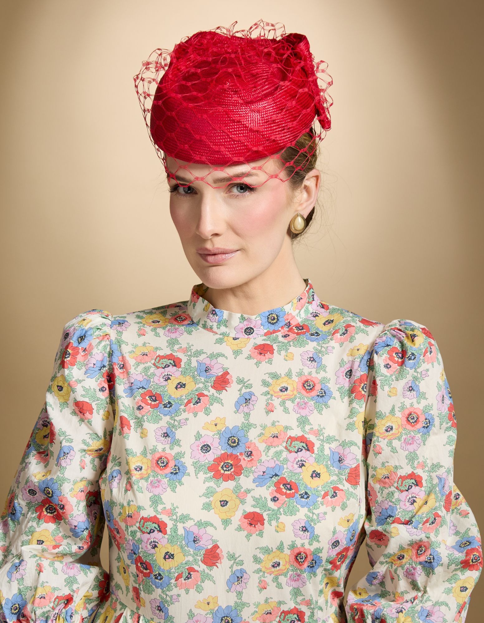 Maeve is a pillbox style hat that sits on the front of your head. Crafted from a vibrant ruby red straw and covered in a chunky vintage inspired veiling, with a straw bow at the rear, this hat is stylish and striking.