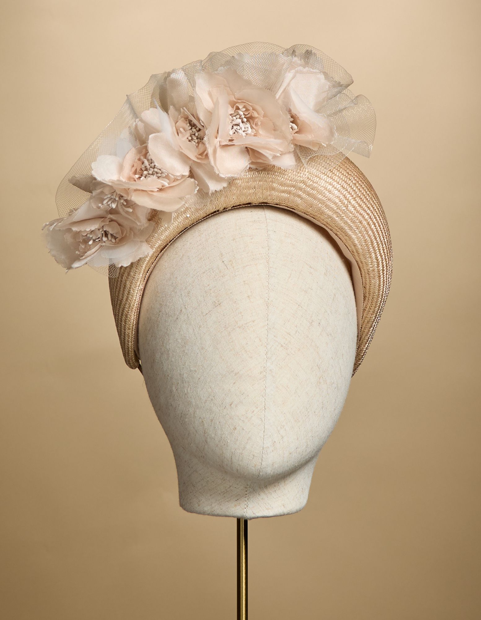 Posy is a lovely champagne coloured wide headband, handcrafted in a fine straw and trimmed with soft waves of crinoline and tonal flowers.