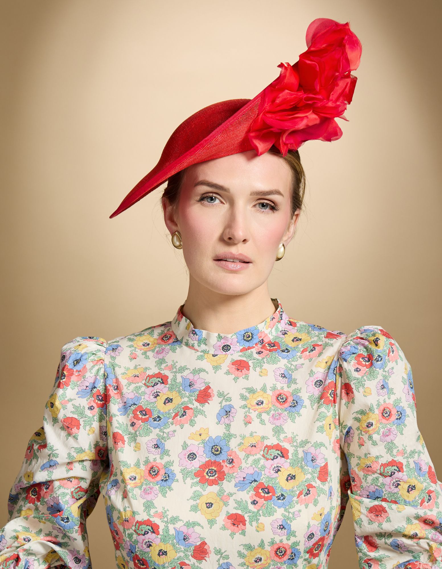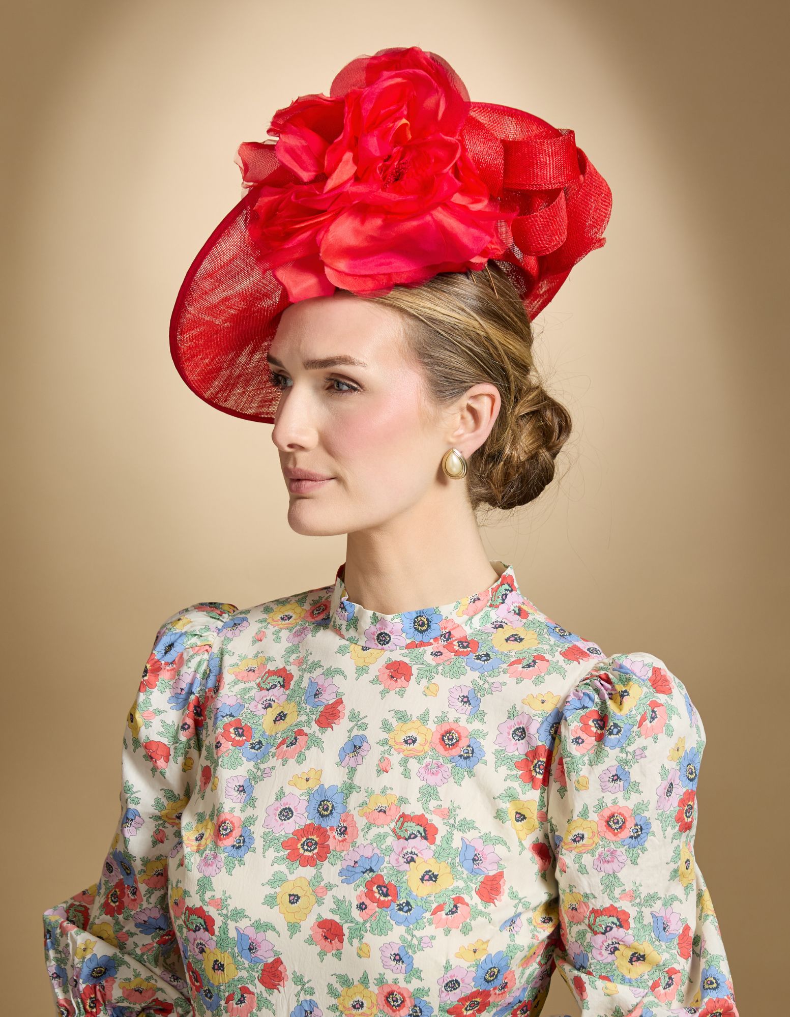 Roxanne is a dramatic sidesweep hat in a bright red colour. Trimmed with a huge red flower and a sinamay twist, this hat is held onto the head with a comfortable wire headband.