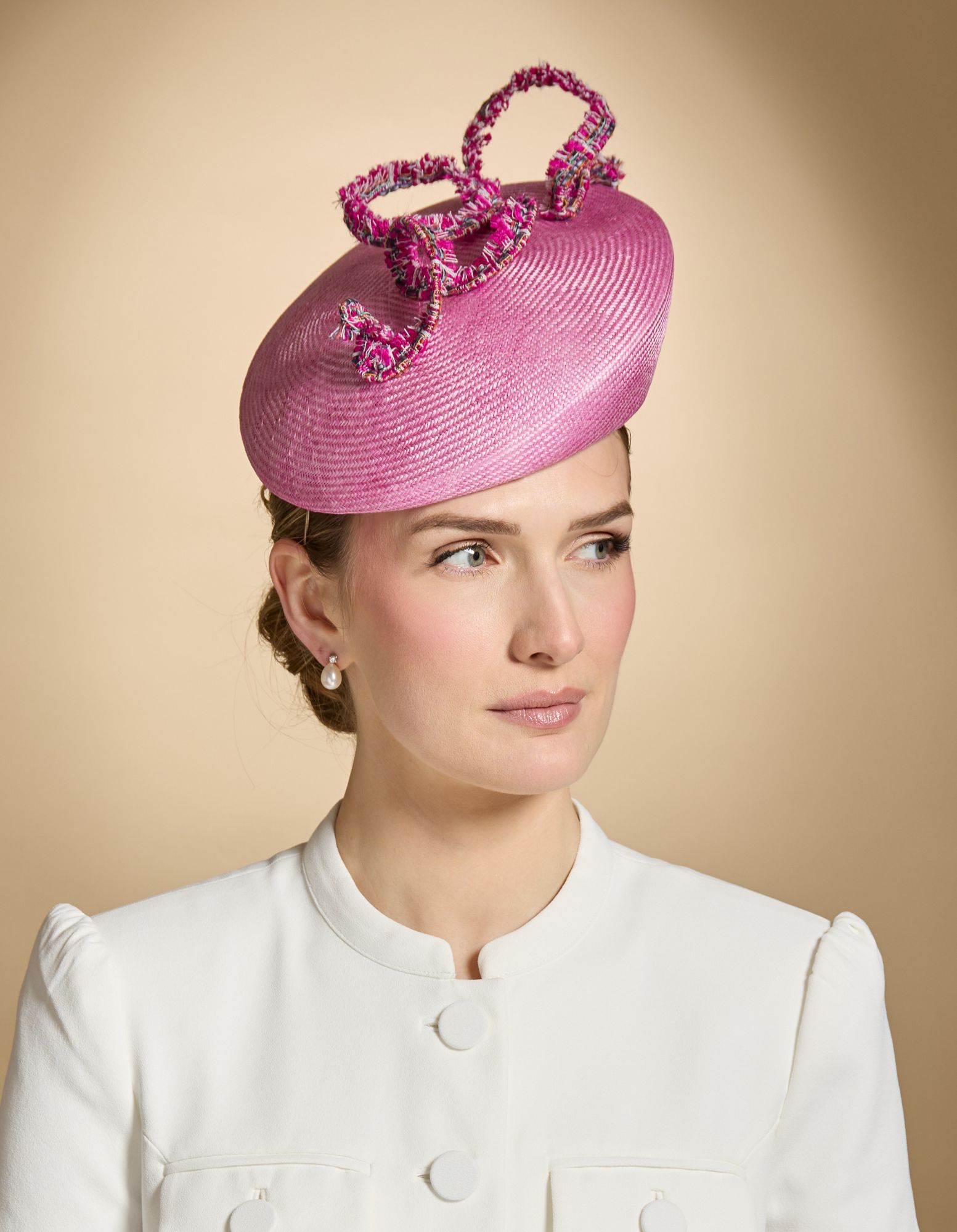 Sadie is such a striking hat! With a deep angle one side creating a stylish and easy to wear hat. Handmade in this gorgeous hand dyed candy pink straw, it is trimmed with a deep fuchsia pink sculptural wired ribbon trim.