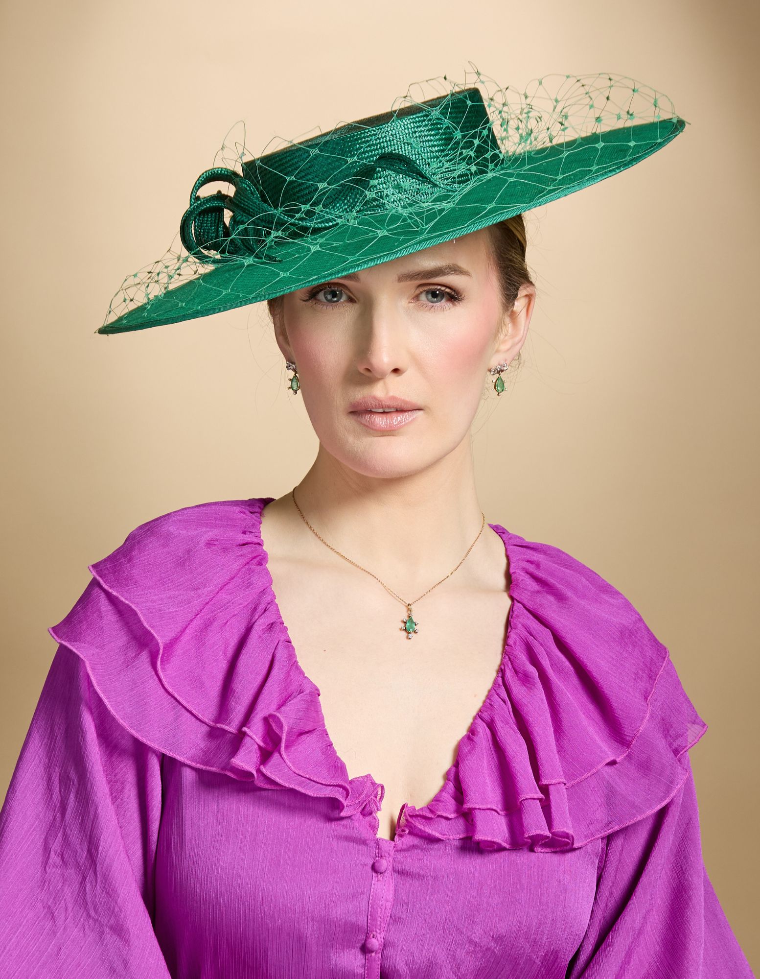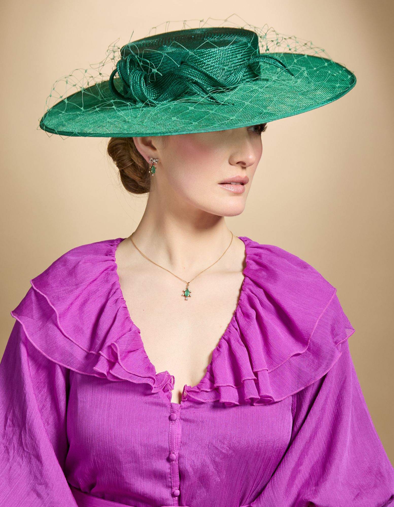 The Billie Boater has a flat sinamay brim and a parasisal straw crown. Trimmed with a lovely loose straw twist and soft veiling, this popular style is such a classic look.
