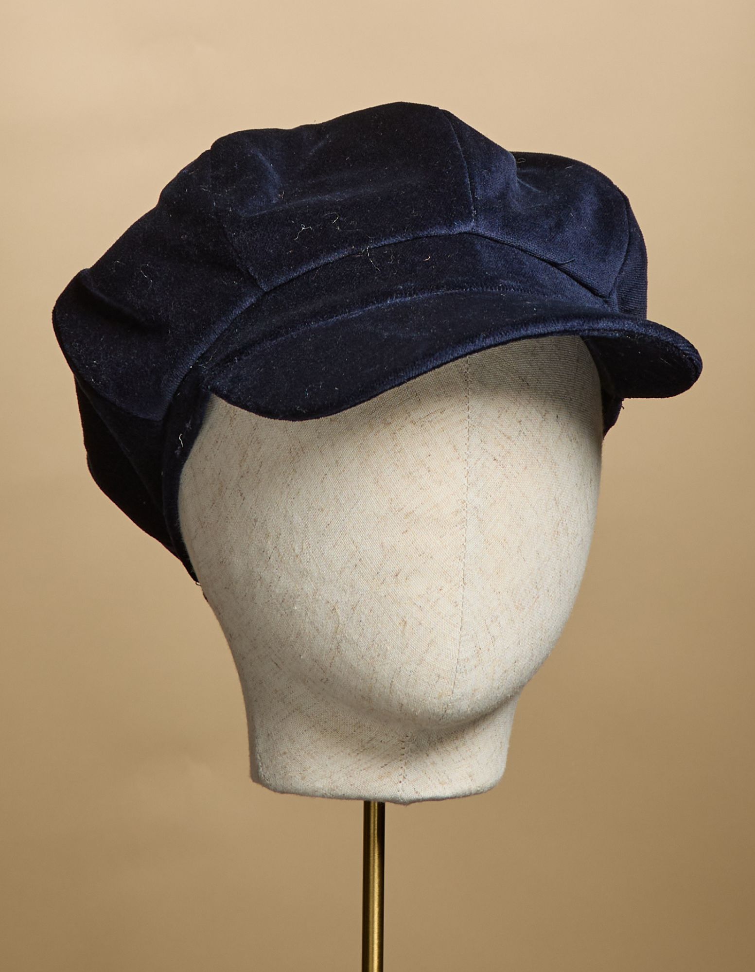 A cotton velvet baker boy cap, finished with a lovely navy satin lining.